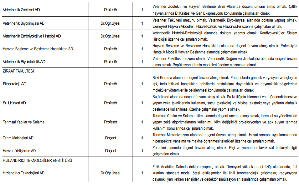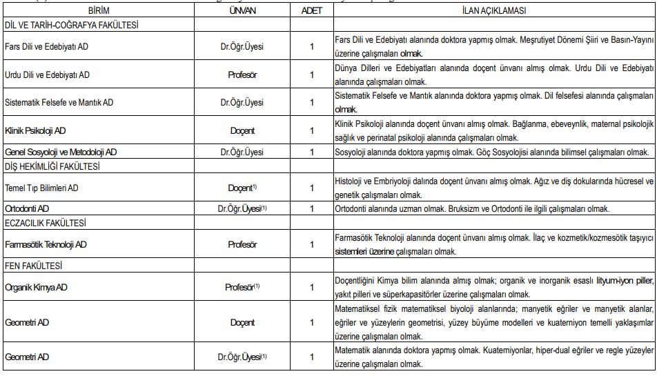 Ankara Üniversitesi’nin yayımladığı ilanda çok sayıda fakülte ve enstitüde farklı akademik unvanlarda kadrolar yer aldı. Öne çıkan bazı birimler ve alanlar şu şekilde: