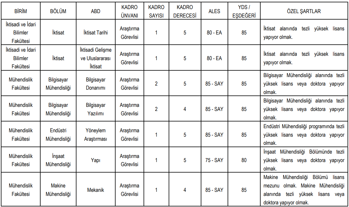 Bu alanlarda başvuracak adayların ilgili mühendislik bölümlerinde tezli yüksek lisans veya doktora yapıyor olmaları, ALES (SAY) 75–85 ve YDS 80–85 aralığında puan şartlarını sağlamaları gerekiyor.