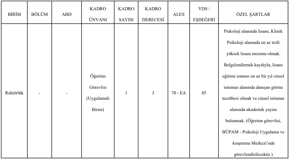 Rektörlük bünyesinde görevlendirilmek üzere 1 öğretim görevlisi (uygulamalı birim) alınacak.