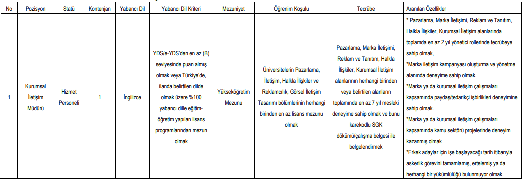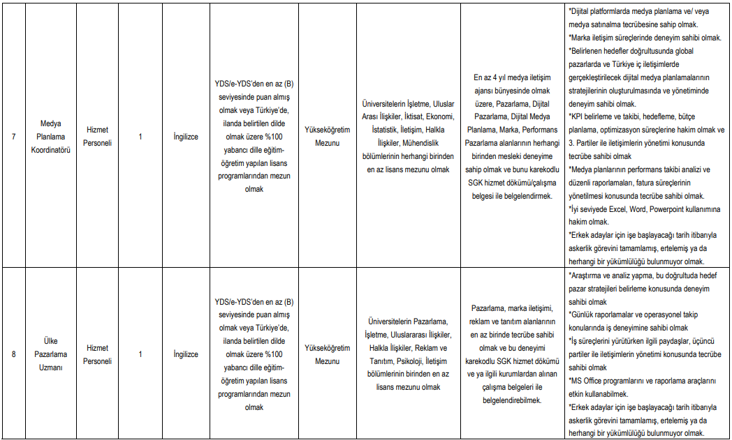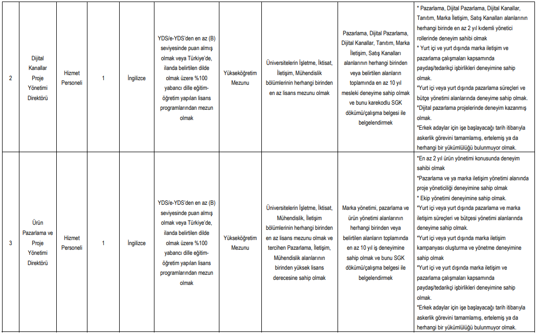 Adayların, başvuru yapacakları pozisyon için tabloda belirtilen eğitim, yabancı dil ve mesleki tecrübe şartlarını eksiksiz olarak taşımaları gerekiyor.