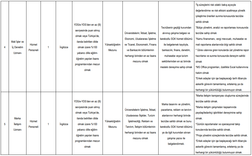 Türkiye Turizm Tanıtım ve Geliştirme Ajansı bünyesinde istihdam edilecek personeller; direktör, hizmet personeli ve destek hizmetleri personeli pozisyonlarında görev alacak. Alım yapılacak kadrolar ve her bir pozisyona ilişkin özel nitelikler, ilanın ekinde yer alan “TGA Personel Alımı Kadroları ve Adaylarda Aranan Nitelikler Tablosu (Ek-1)” ile belirlendi.