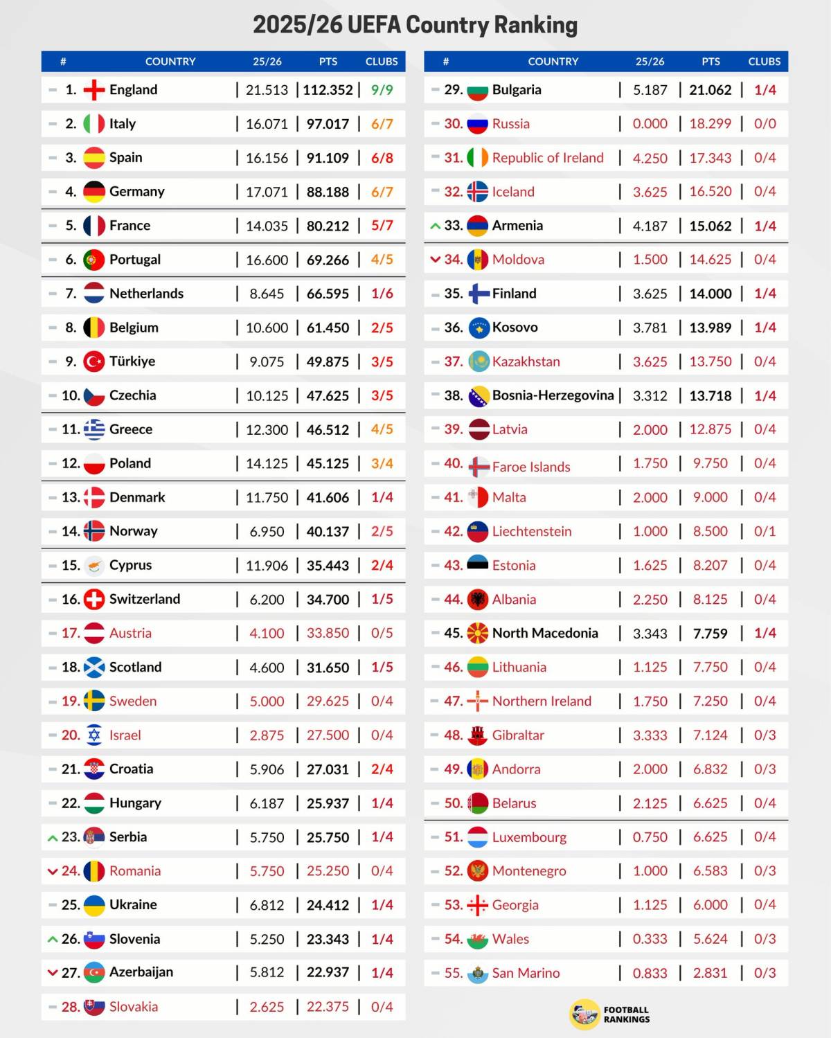 2025/26 sezonu UEFA ülke puanı sıralaması güncellendi. Avrupa kupalarındaki performanslara göre belirlenen tabloda zirvede 112.352 puanla England yer aldı. İngiliz kulüpleri sezon genelinde 21.513 puan toplarken 9 takımın tamamı organizasyonlarda mücadele etti.