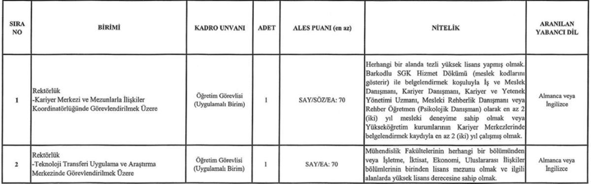 Adayların, öğretim görevlisi kadrolarına başvurabilmeleri için ALES’ten en az 70 puan almış olmaları gerekiyor. Ayrıca yabancı dil şartı da ilanda önemli bir kriter olarak öne çıkıyor.
