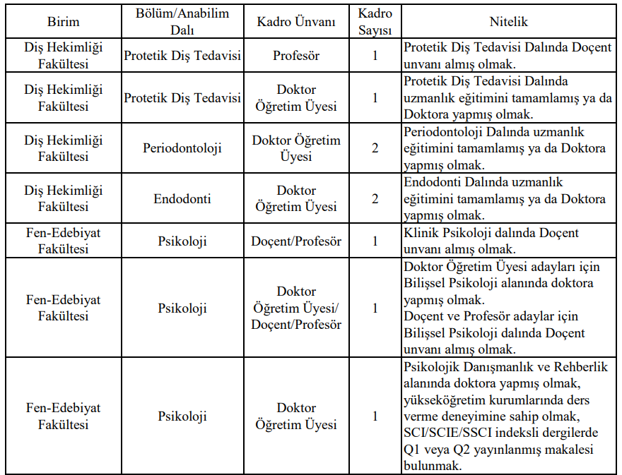 Üniversite; profesör, doçent ve doktor öğretim üyesi unvanlarında olmak üzere çeşitli bölümlere akademik personel istihdam edecek. Adaylardan, unvana göre farklı belge ve nitelikler talep ediliyor.