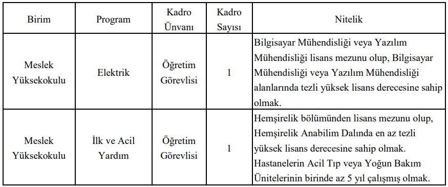 Üniversite, iki farklı programa öğretim görevlisi alımı yapacak.