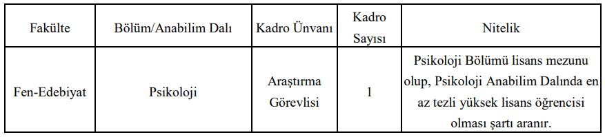 Fen-Edebiyat Fakültesi Psikoloji Bölümü için 1 araştırma görevlisi alınacak.