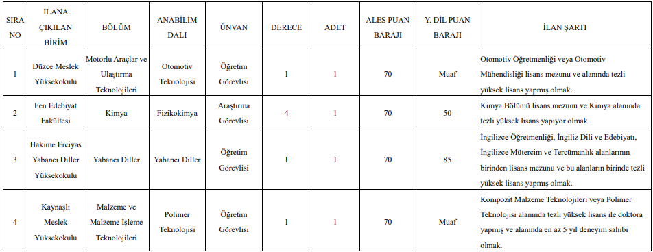 Düzce Üniversitesi ise hem öğretim elemanı hem de öğretim üyesi kadroları için ilan yayımladı.