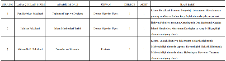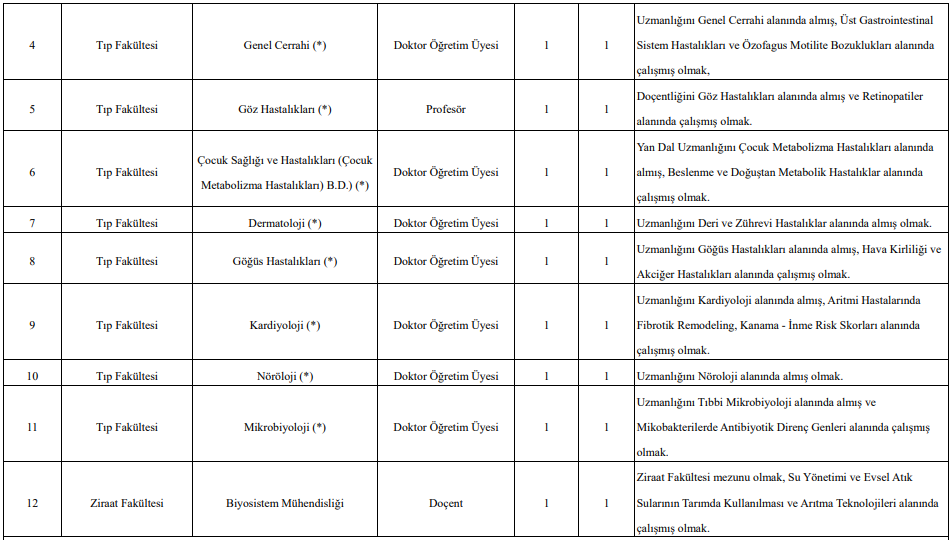 gibi birçok birimde profesör, doçent ve doktor öğretim üyesi kadroları açıldı.