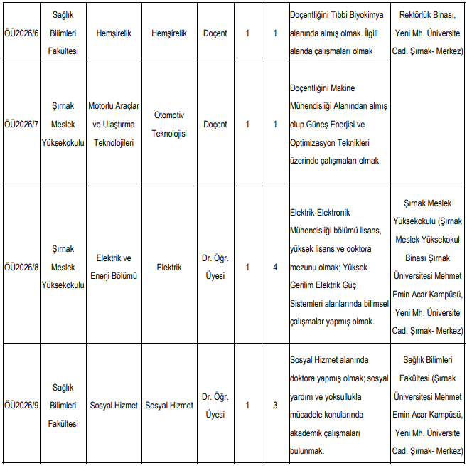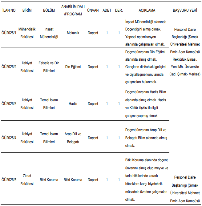 Şırnak Üniversitesi’nde ise mühendislikten ilahiyata, ziraattan sağlık bilimlerine kadar geniş bir yelpazede kadro ilanı yayımlandı. Toplamda 9 farklı akademik kadro için alım yapılacağı açıklandı.