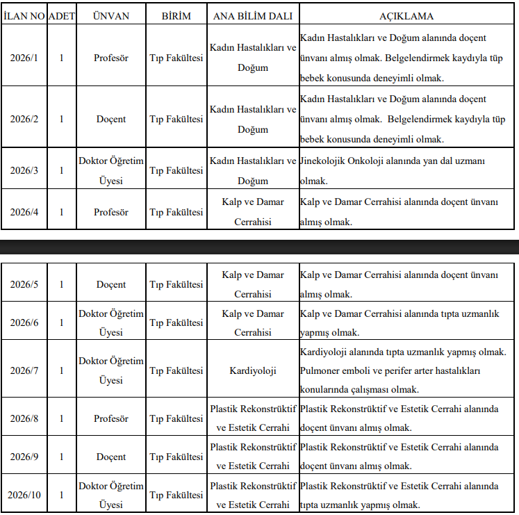 İlanlarda yer alan bilgilere göre her iki üniversite de profesör, doçent ve doktor öğretim üyesi kadrolarına alım yapacak.