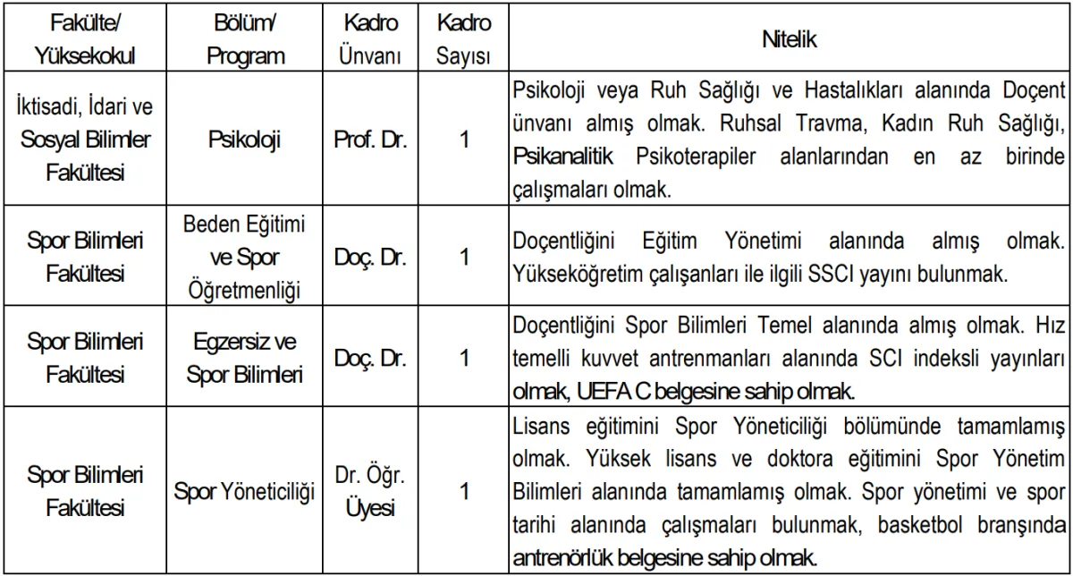 İstanbul Gedik Üniversitesi ise daha geniş kapsamlı bir ilan yayımladı. Psikoloji, spor bilimleri ve spor yöneticiliği gibi alanlarda profesör, doçent ve doktor öğretim üyesi alımları yapılacak. Bunun yanı sıra araştırma görevlisi kadroları da dikkat çekiyor.
