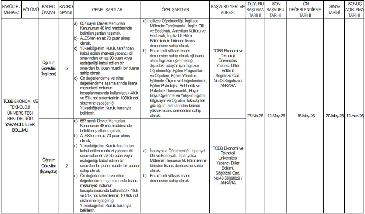 TOBB Ekonomi ve Teknoloji Üniversitesi ise yabancı diller bölümüne öğretim görevlisi alımı yapacağını duyurdu. İngilizce ve İspanyolca alanlarında toplam 7 kişilik kadro açıldı.