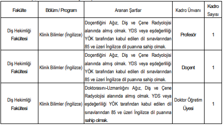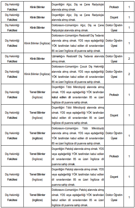 İlanda profesör, doçent ve doktor öğretim üyesi seviyelerinde çok sayıda pozisyon açıldı. Ağız, Diş ve Çene Radyolojisi, Restoratif Diş Tedavisi, Çocuk Diş Hekimliği, Tıbbi Mikrobiyoloji ve Patoloji gibi alanlarda uzman akademisyenler aranıyor.