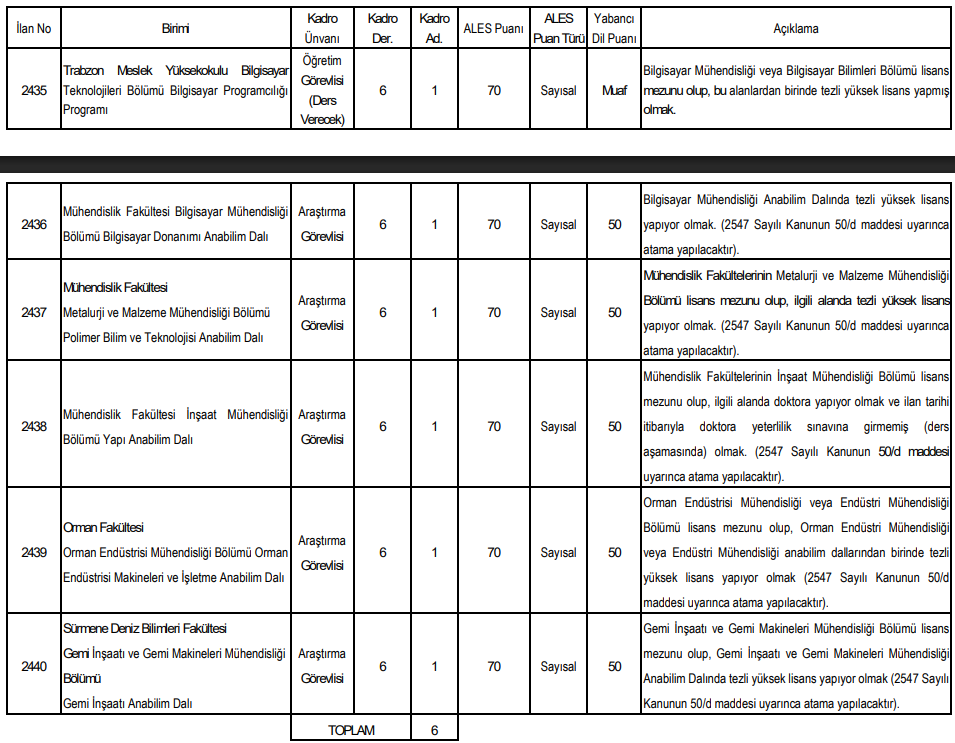 Trabzon’daki Karadeniz Teknik Üniversitesi de çok sayıda araştırma görevlisi ve öğretim görevlisi alımı yapacağını duyurdu. Mühendislik Fakültesi başta olmak üzere farklı fakültelerde toplam 6 kişilik kadro açıldı.