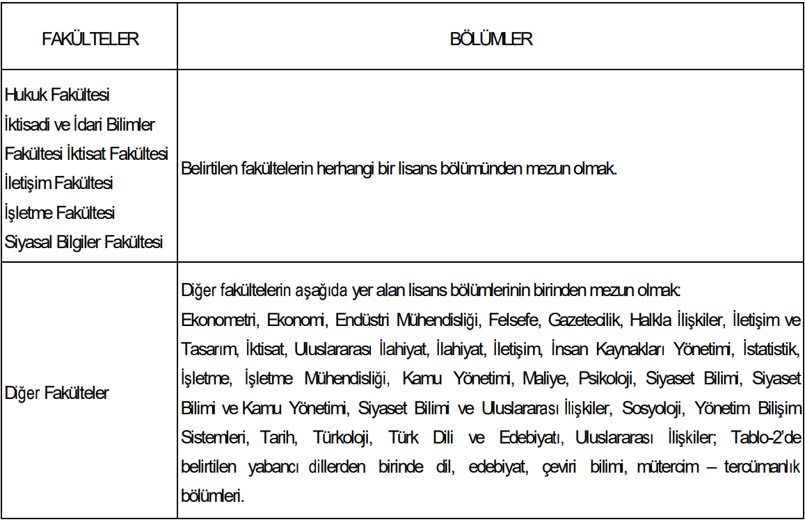 İlana göre Hukuk, İktisadi ve İdari Bilimler, İletişim, İşletme ve Siyasal Bilgiler Fakültelerinin tüm lisans bölümlerinden mezun olan adaylar başvuru yapabilecek. Ayrıca iktisat, kamu yönetimi, sosyoloji, psikoloji, uluslararası ilişkiler, tarih, Türk dili ve edebiyatı, mühendislik ve iletişim alanları da kapsama alındı.