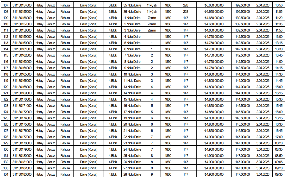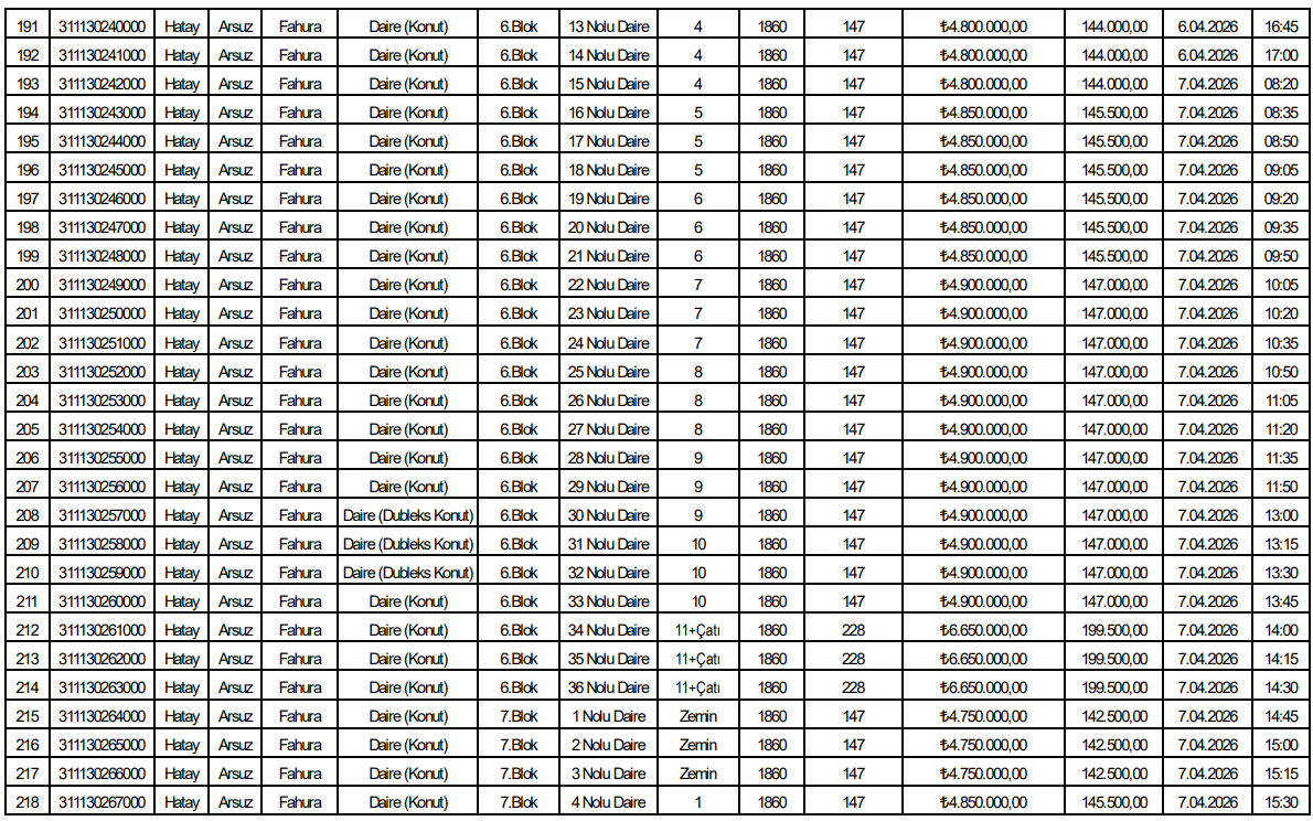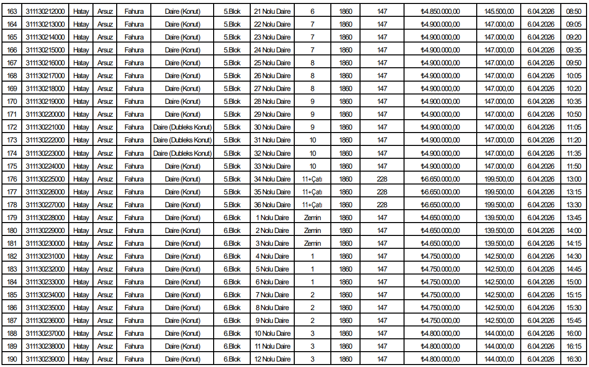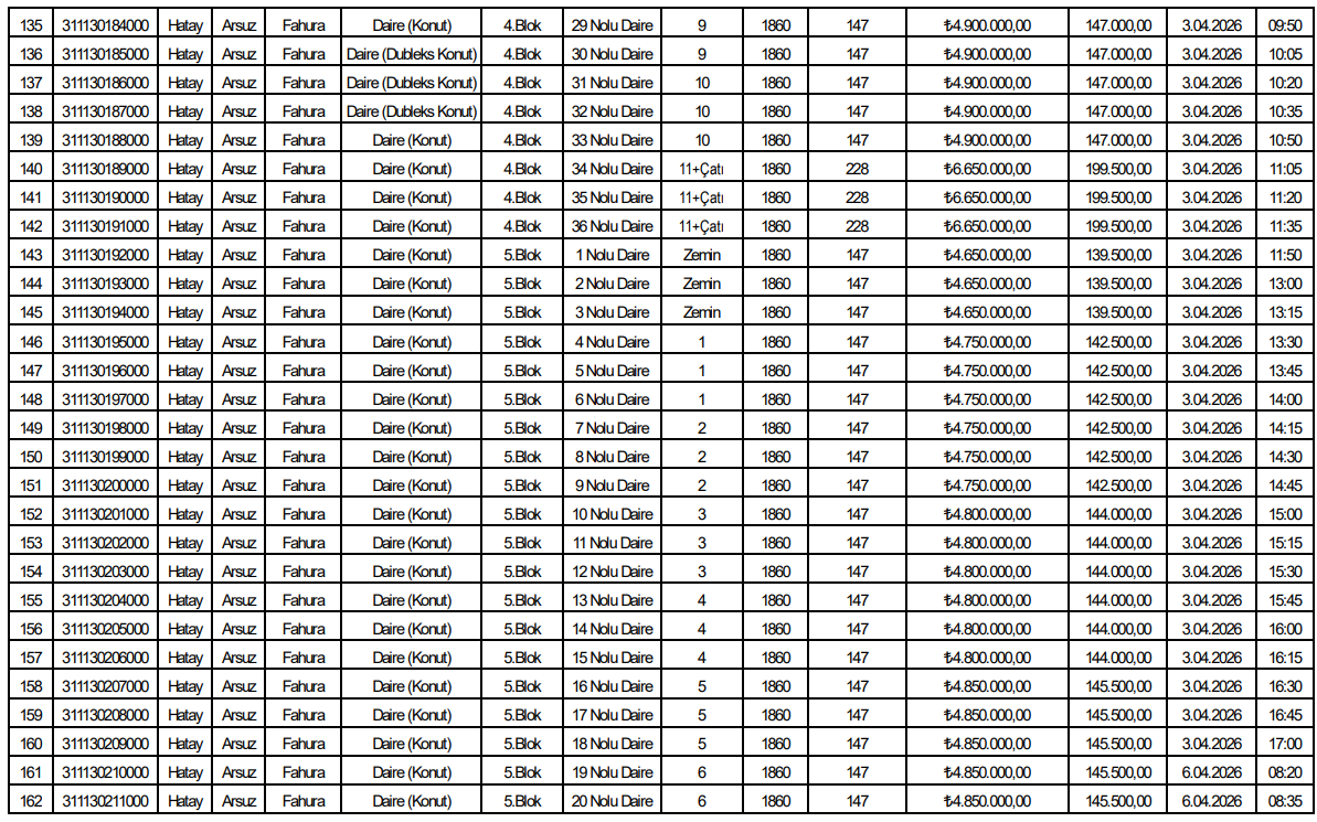Listede yer alan verilere göre toplam 153 bağımsız bölüm satışa sunuldu. Tüm taşınmazlar konut niteliğinde olup Arsuz Fahura Mahallesi’nde aynı parsel alanı üzerinde konumlanıyor.