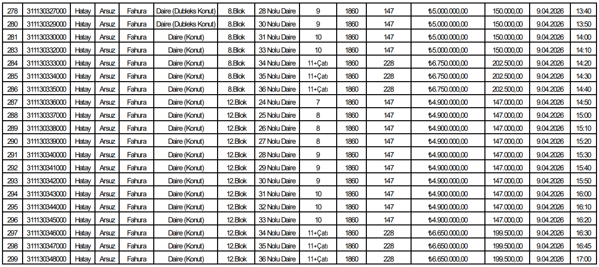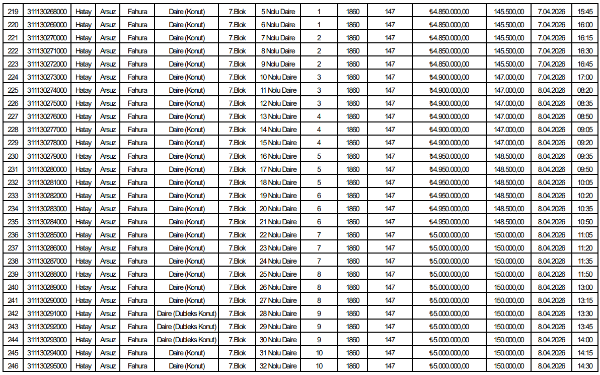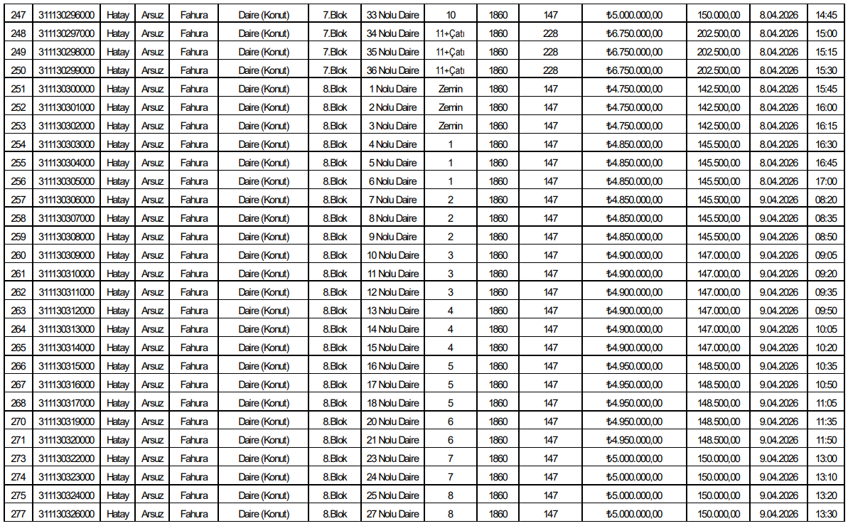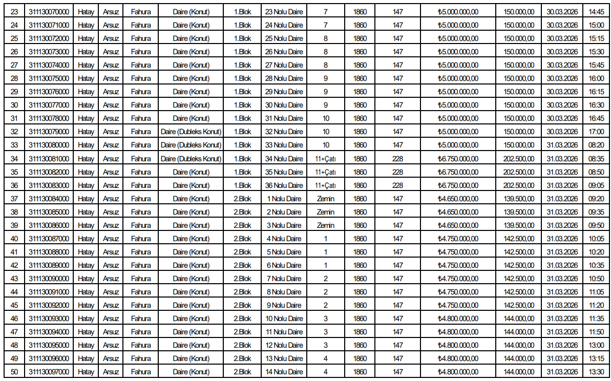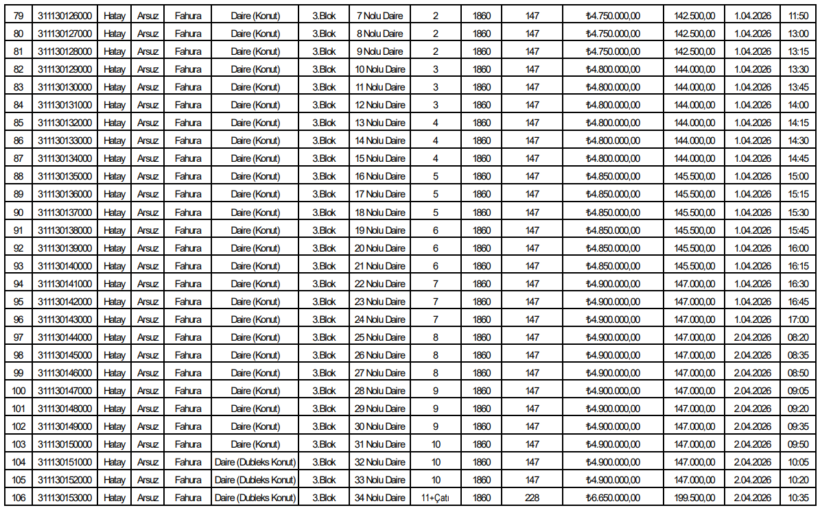 Listede yer alan verilere göre toplam 153 bağımsız bölüm satışa sunuldu. Tüm taşınmazlar konut niteliğinde olup Arsuz Fahura Mahallesi’nde aynı parsel alanı üzerinde konumlanıyor.