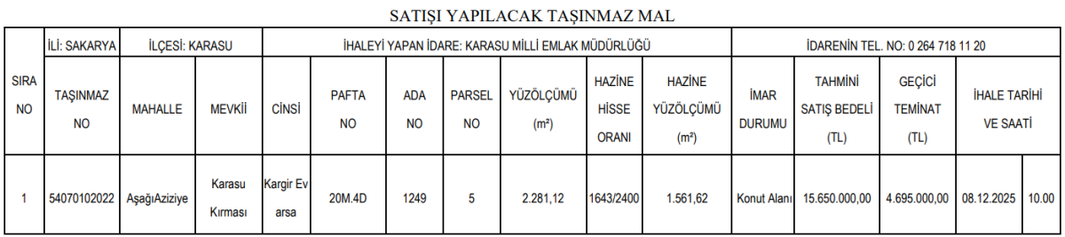 Sakarya’nın Karasu ilçesinde bulunan ve mülkiyeti Maliye Hazinesine ait bir taşınmaz, Karasu Kaymakamlığı Milli Emlak Müdürlüğü tarafından satışa sunuluyor. Aşağı Aziziye Mahallesi’nde yer alan taşınmazın ihalesi, 2886 sayılı Devlet İhale Kanunu’nun 45. maddesi çerçevesinde açık teklif usulü ile gerçekleştirilecek. İhale, 08 Aralık 2025 günü saat 10.00’da Karasu Milli Emlak Müdürlüğünde toplanacak komisyon huzurunda yapılacak.
