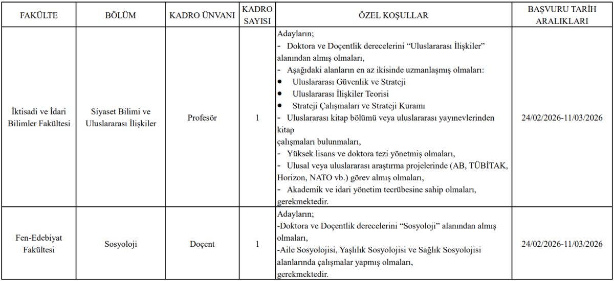 İktisadi ve İdari Bilimler Fakültesi Siyaset Bilimi ve Uluslararası İlişkiler Bölümü için 1 profesör kadrosu ilan edildi. Kadroya başvuracak adayların doktora ve doçentlik derecelerini Uluslararası İlişkiler alanından almış olmaları şartı bulunuyor.