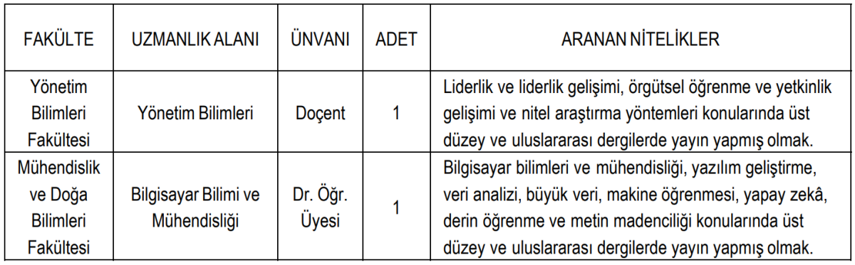 Öğretim üyesi başvuruları 24 Kasım 2025’te başlamış olup, son başvuru tarihi 8 Aralık 2025 olarak açıklandı. Adayların, sistem üzerinden başvurularını tamamlamalarının ardından bilimsel dosyalarının değerlendirileceği ifade edildi.