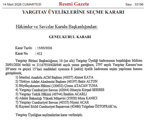Yargıtay üyeliğine seçime ilişkin karar, 14 Mart 2026 tarihli ve 33196 sayılı Resmî Gazete’de yayımlandı. HSK Genel Kurulu’nun 13 Mart 2026 tarihli toplantısında alınan karar doğrultusunda, yargı teşkilatının farklı birimlerinde görev yapan isimler Yargıtay üyesi olarak belirlendi.
