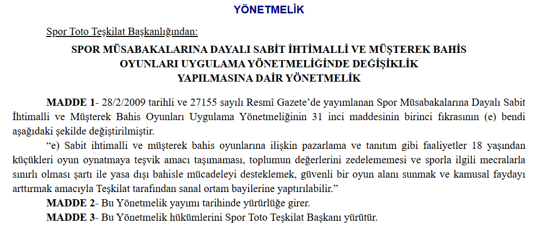 13 Şubat 2026 tarihli Resmî Gazete’de yayımlanan yönetmelik değişikliği ile Spor Toto Teşkilat Başkanlığı tarafından yürütülen spor müsabakalarına dayalı sabit ihtimalli ve müşterek bahis oyunlarına ilişkin önemli bir düzenleme yapıldı. 28 Şubat 2009 tarihli ve 27155 sayılı Resmî Gazete’de yayımlanan mevcut uygulama yönetmeliğinin 31’inci maddesinde değişikliğe gidildi.