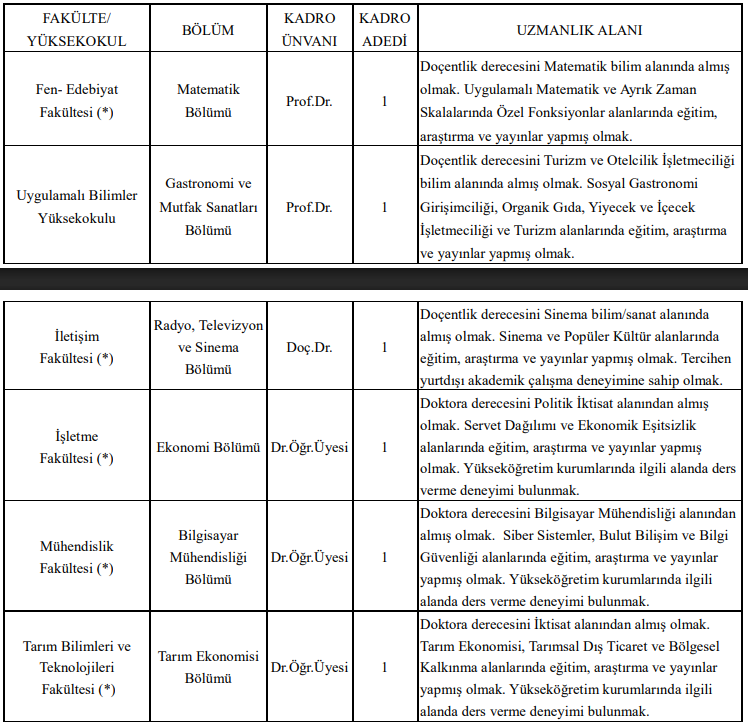 İlan kapsamında farklı akademik birimlerde 6 kadro için alım yapılacak.