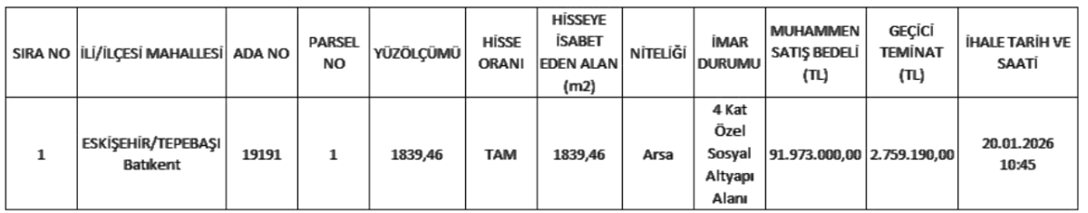 İhale kapsamında satışa sunulan taşınmazın mülkiyetinin tamamen Tepebaşı Belediyesi’ne ait olduğu belirtildi. İhale, 1 adet taşınmazın satışı işini kapsıyor. Taşınmazın konumu, yüzölçümü, imar durumu, satış bedeli ve geçici teminat tutarı gibi detaylar, ihale şartnamesi ve eklerinde yer alıyor.