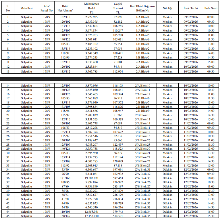 Belediye Meclisi’nin 07 Haziran 2024 tarihli ve 06-67 sayılı kararı ile Belediye Encümeni’nin 08 Ocak 2026 tarihli ve 04 sayılı kararı doğrultusunda satışa çıkarılan taşınmazlar, Selçuklu Mahallesi 178 ada 9 parsel üzerinde yer alıyor. Toplamda 45 bağımsız bölümden oluşan bu satış portföyü, hem mesken hem de dükkân nitelikli taşınmazları kapsıyor.