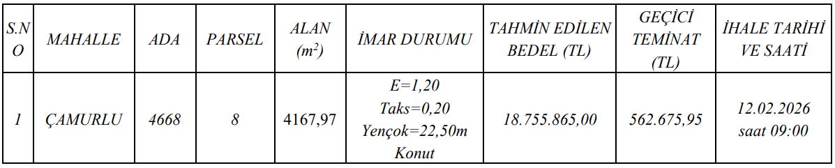 Resmî ilan kapsamında açıklanan bilgilere göre ihale, 12 Şubat 2026 tarihinde saat 09.00’da yapılacak. İhaleye katılmak isteyen isteklilerin, gerekli belgeleri ve teminatları belirtilen süre içerisinde tamamlamaları gerekiyor. Süre ve saat konusunda herhangi bir esneklik tanınmayacağı ifade ediliyor.
