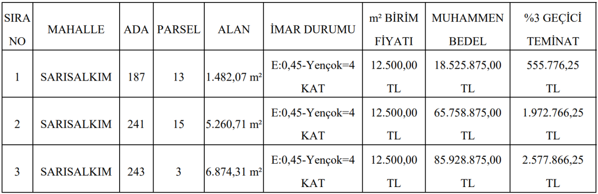 İhale kapsamında satışa çıkarılan taşınmazların tamamı Sarısalkım Mahallesi’nde yer alıyor. Açıklanan bilgilere göre birinci arsa 1.482,07 metrekare büyüklüğünde olup yaklaşık 18 milyon 525 bin TL muhammen bedelle listelendi. İkinci arsa 5.260,71 metrekare alanıyla 65 milyon 758 bin TL muhammen bedelle satışa sunulurken, üçüncü arsa ise 6.874,31 metrekare büyüklüğünde ve 85 milyon 928 bin TL muhammen değere sahip olarak açıklandı.
