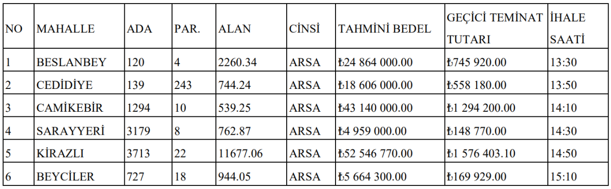 Sarayyeri Mahallesi’nde bulunan 762,87 metrekarelik arsa 4 milyon 959 bin TL, Kirazlı Mahallesi’ndeki 11.677,06 metrekarelik büyük parsel ise 52 milyon 546 bin 770 TL tahmini bedelle satışa sunulacak. Beyciler Mahallesi’nde yer alan 944,05 metrekarelik arsa için belirlenen bedel ise 5 milyon 664 bin 300 TL.