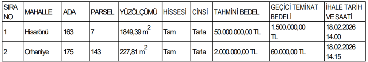Satışa çıkarılan ikinci taşınmaz ise Orhaniye Mahallesi sınırları içerisinde bulunuyor. 175 ada 143 parsel numaralı taşınmazın yüzölçümü 227,81 metrekare olarak açıklandı. Tam hisse tarla vasfındaki bu taşınmaz için tahmini bedel 2 milyon TL, geçici teminat bedeli ise 60 bin TL olarak belirlendi.