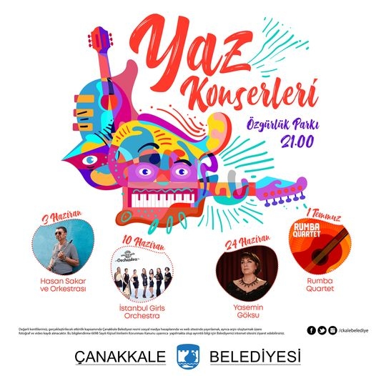 Çanakkale Belediyesi Yaz Konseri kapsamında Özgürlük Parkında birbirinden güzel konserler düzenleyecek. Konserlerin ilki Hasan Sakar ve Orkestrası tarafından yarın saat 21.00’da verilecek. Belediyeden etkinlikler ile ilgili şu ifadeler kullanıldı, “Özgürlük Parkının eşsiz manzarasında gerçekleşecek Yaz Konserleri ile birbirinden renkli performansları izlemek, hep bir ağızdan söylenen şarkılara eşlik ederek keyifli vakit geçirmek için buluşmayı unutmayalım”