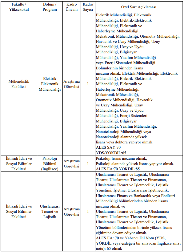 İktisadi, İdari ve Sosyal Bilimler Fakültesi bünyesinde yer alan Psikoloji Bölümü (İngilizce) için de 1 araştırma görevlisi alımı gerçekleştirilecek. Adaylarda aranacak koşullar şu şekilde açıklandı:
