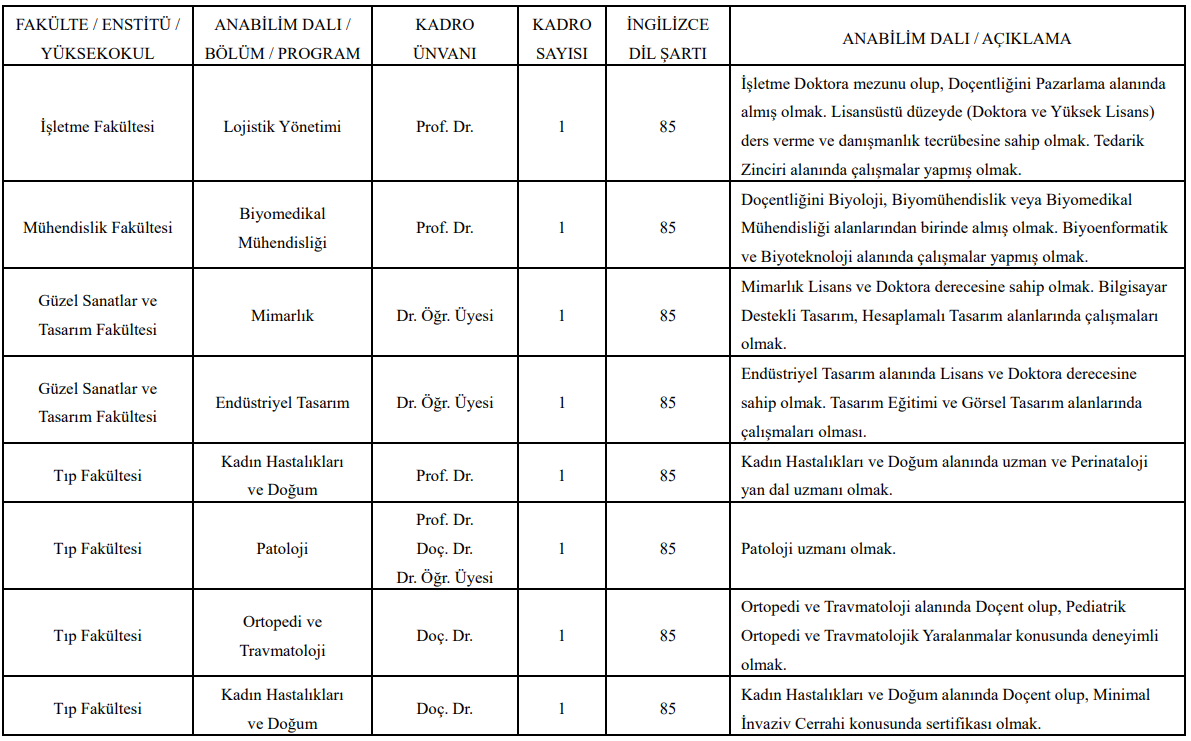 Bu alanlarda Prof. Dr., Doç. Dr. ve Dr. Öğr. Üyesi unvanlarında alımlar yapılacak.