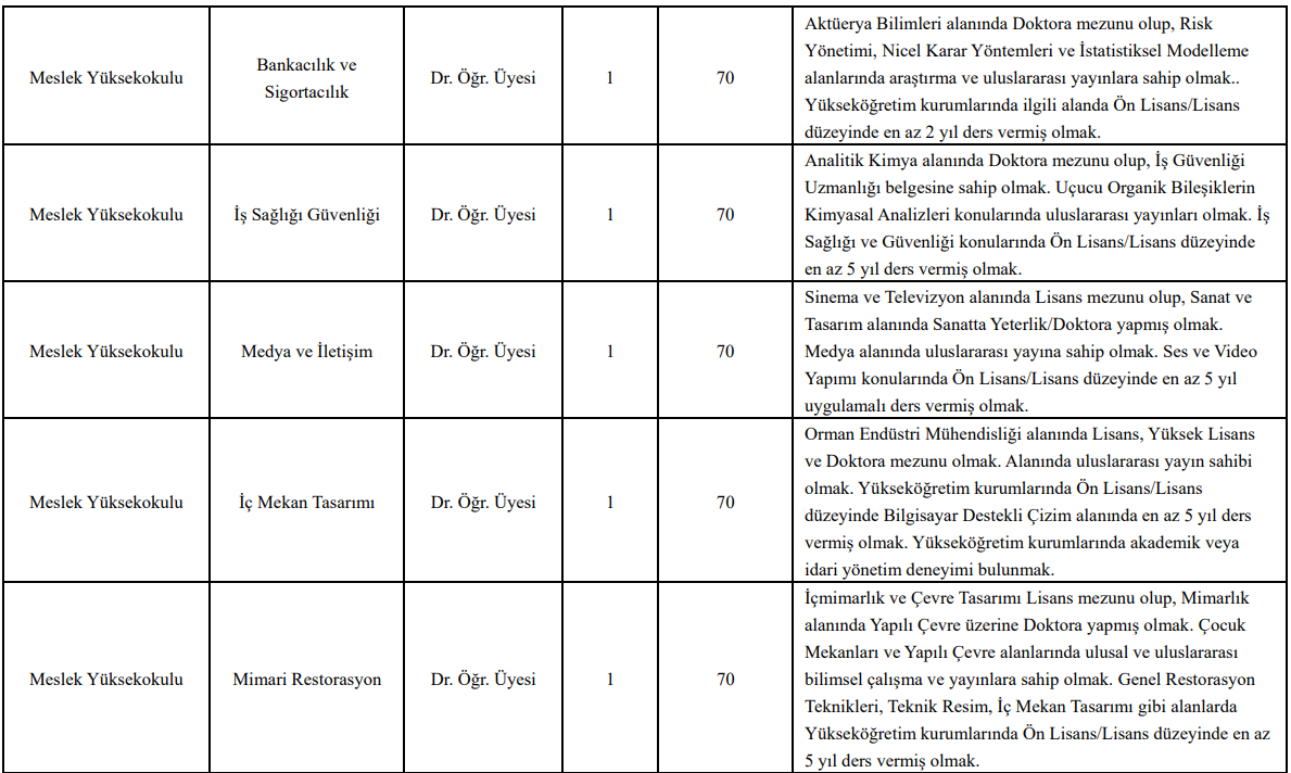 Meslek yüksekokulu kadrolarında, ilgili alanlarda en az 2 ila 5 yıl ders verme tecrübesi ve uluslararası yayın şartları dikkat çekiyor.