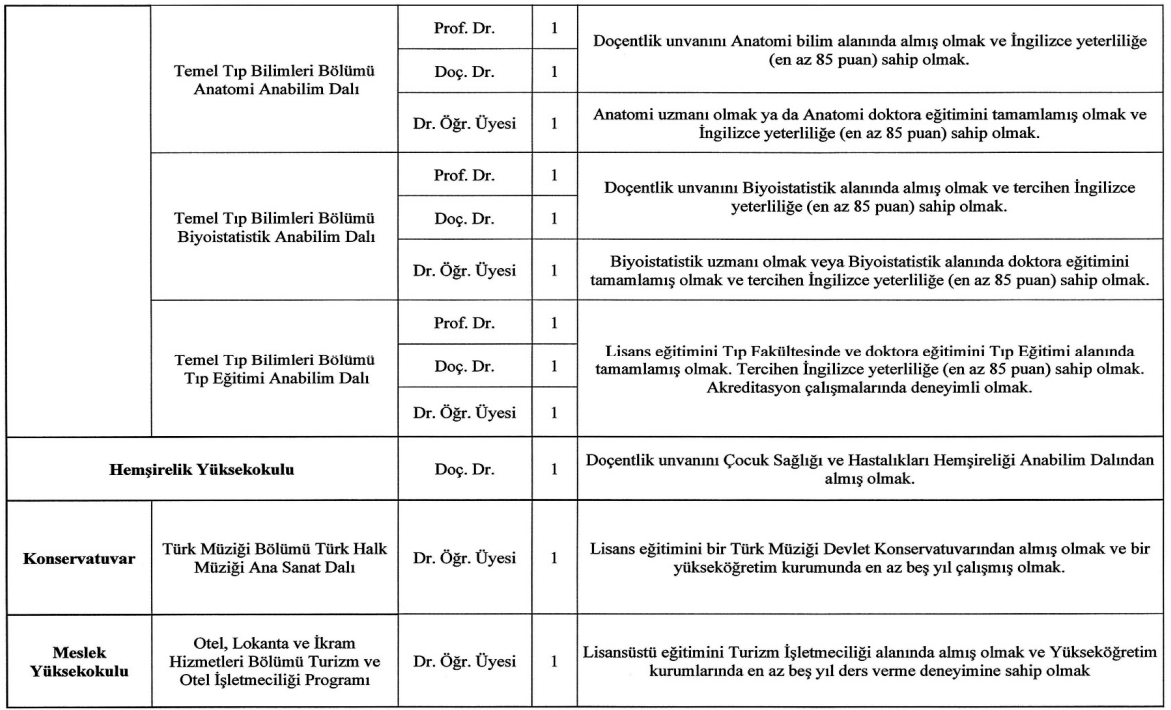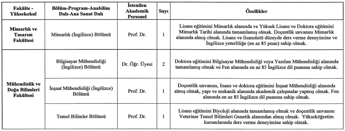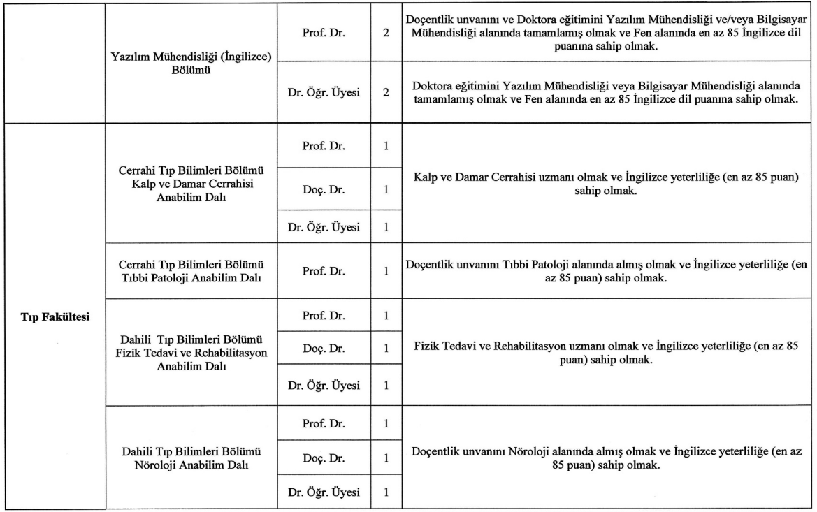 Profesör kadrosuna başvuracak adaylardan; YÖK formatında özgeçmiş, başlıca araştırma eserini belirten dilekçe, noter onaylı diploma ve unvan belgeleri, bilimsel çalışma ve yayınları kapsayan dosyalar talep ediliyor. Ayrıca İngilizce eğitim verebilmek için YDS’den en az 85 puan veya eşdeğer bir belge şartı bulunuyor.