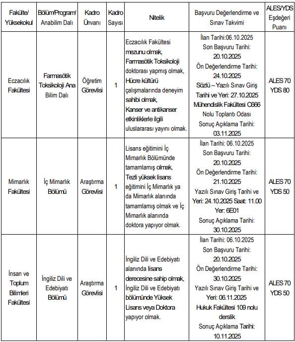 Şartlar: Eczacılık Fakültesi mezunu olmak, Farmasötik Toksikoloji alanında doktora yapmış olmak, hücre kültürü çalışmalarında deneyim sahibi olmak, kanser ve antikanser etkinlikler üzerine uluslararası yayın yapmış olmak.