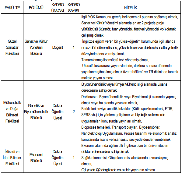 Şartlar: İlgili alanda doçentlik unvanı almış olmak, sanat ve kültür yönetimi projelerinde yürütücülük yapmış olmak, İngilizce eğitim veren kurumlarda ders verme deneyimine sahip olmak, tamamlanmış lisansüstü tez yönetmiş olmak ve ulusal/uluslararası yayınevlerinde yayın sahibi olmak.