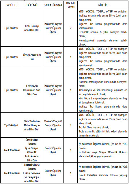 Tıbbi Patoloji Ana Bilim Dalı için Profesör, Doçent veya Doktor Öğretim Üyesi unvanlarında 2 kadro ayrıldı. Adayların YDS, YÖKDİL, TOEFL, e-TEP veya eşdeğeri İngilizce sınavlardan en az 85 puan almış olmaları şartı bulunuyor. Ayrıca İngilizce tıp lisans programlarında ders vermiş olmak, uzmanlık sonrası en az 5 yıl deneyime sahip olmak ve hematopatoloji alanında deneyimli olmak gerekiyor.