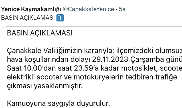 Valilik tarafından yapılan bilgilendirmede, “Yenice ilçesinde olumsuz hava koşullarından dolayı 29.11.2023 Çarşamba günü saat 10.00’dan saat 23.59’a kadar motosiklet, scooter, elektrikli scooter ve motokuryelerin tedbiren trafiğe çıkması yasaklanmıştır. Kamuoyuna saygıyla duyurulur” denildi.