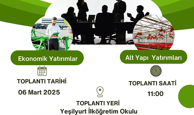 Toplantı, 6 Mart 2025 tarihinde saat 11:00’de Yeşilyurt İlköğretim Okulu'nda gerçekleştirilecek. Etkinlikte, ekonomik yatırımlar ve altyapı yatırımları ile ilgili detaylı bilgiler verilecek.