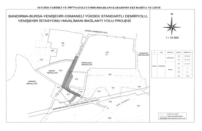 17 Ocak 2026 tarihli Resmî Gazete’de yayımlanan 10879 sayılı Cumhurbaşkanı Kararı ile Bursa’nın Yenişehir ilçesindeki bazı taşınmazlar için acele kamulaştırma süreci başlatıldı.