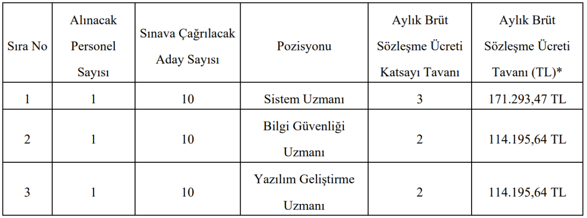 Pozisyonlara göre belirlenen aylık brüt sözleşme ücret tavanları şöyle: