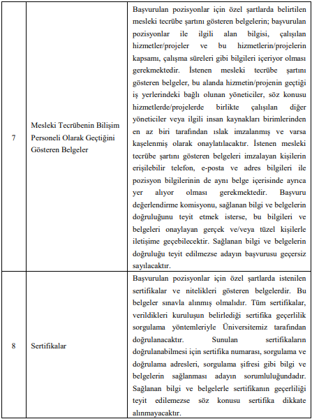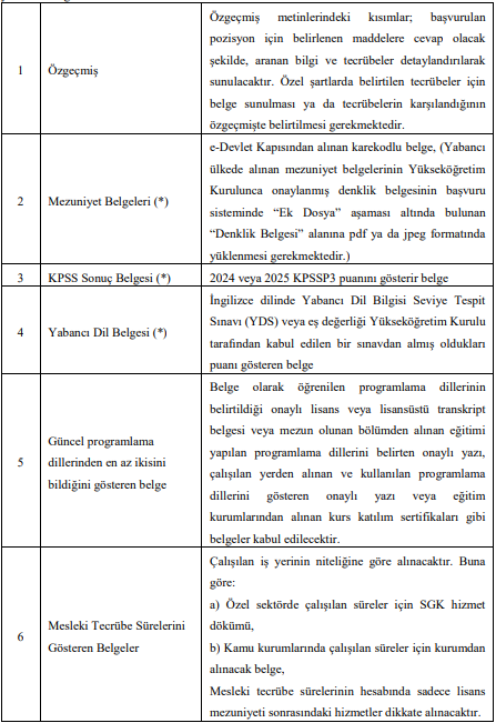 Adaylardan özgeçmiş, mezuniyet belgesi, KPSS sonuç belgesi, yabancı dil belgesi, en az iki programlama dilini bildiğini gösteren belge, mesleki tecrübe belgeleri ve varsa sertifikalar talep ediliyor. Belgelerin pdf veya jpeg formatında sisteme yüklenmesi gerekiyor.