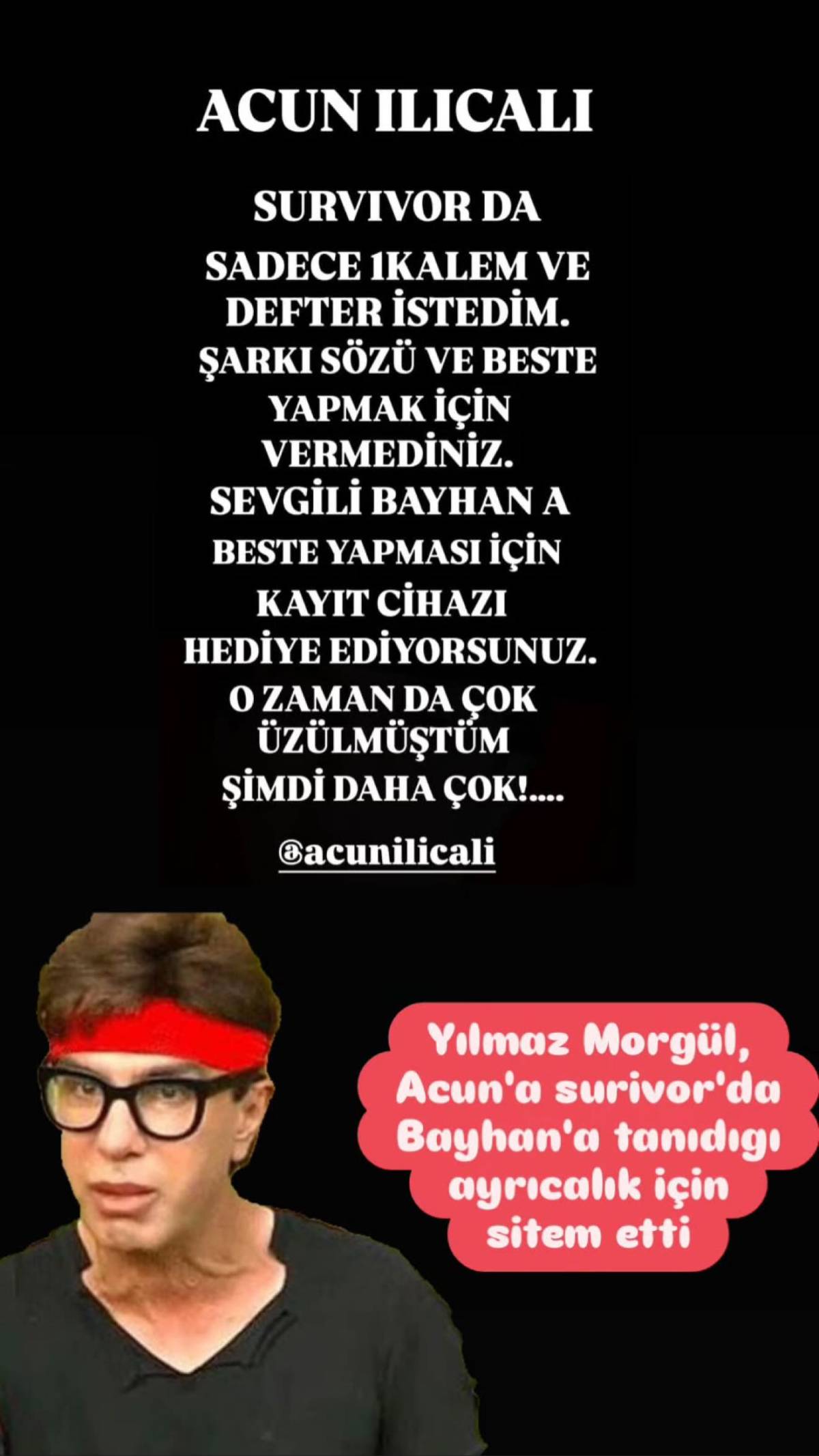 “Acun Ilıcalı, Survivor’da sadece 1 kalem ve defter istedim. Şarkı sözü ve beste yapmak için vermediniz. Sevgili Bayhan’a beste yapması için kayıt cihazı hediye ediyorsunuz. O zaman da çok üzülmüştüm. Şimdi daha çok…”