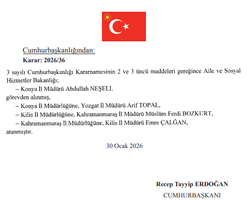 Cumhurbaşkanlığı tarafından alınan 2026/36 sayılı karar, 31 Ocak 2026 tarihli Resmî Gazete’de yayımlanarak yürürlüğe girdi. Karar kapsamında Aile ve Sosyal Hizmetler Bakanlığına bağlı il müdürlüklerinde görevden alma ve yeni atamalar gerçekleştirildi. Cumhurbaşkanı Recep Tayyip Erdoğan’ın imzasını taşıyan karar, 3 sayılı Cumhurbaşkanlığı Kararnamesinin 2’nci ve 3’üncü maddeleri uyarınca alındı. Düzenleme, bakanlık teşkilatı içerisinde il düzeyinde yapılan kapsamlı görev değişikliklerini içeriyor.
