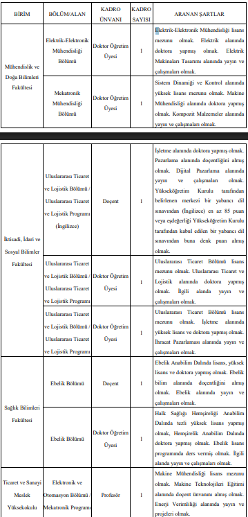 Mekatronik Mühendisliği Bölümü: 1 Doktor Öğretim Üyesi alınacak. Makine Mühendisliği alanında doktora yapmış ve Kompozit Malzemeler alanında yayınları olan adaylar tercih edilecek.
