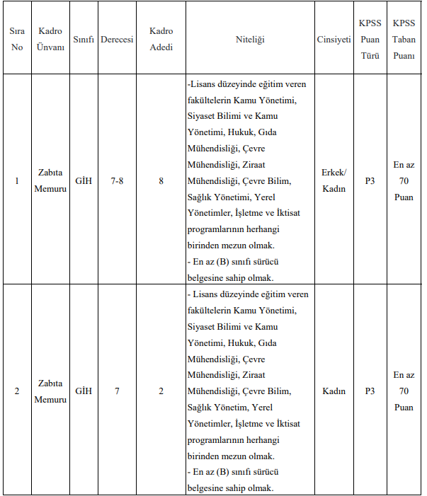 Dilovası Belediye Başkanlığı tarafından yayımlanan ilana göre toplam 10 zabıta memuru alınacak. Kadroların 8’i erkek ve kadın adaylara açıkken, 2 kadro yalnızca kadın adaylara ayrıldı.